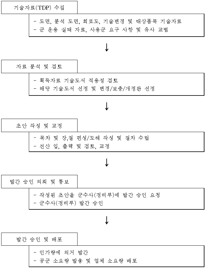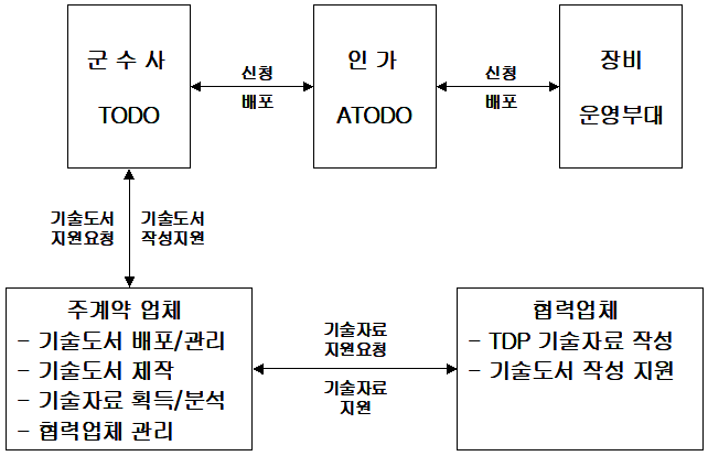 o 군수사(정비부)에 기술도서 후속판 발간 승인 요청 o 승인된 기술도서 후속판을 인가된 수량대로 발간하여 군수사로 발송 및 업체에 배포 o 00체계 기술도서 인가 목록에 대한 최신 현황 유지 o 주계약업체, 협력업체 및 국외업체 관련 기술자료(TDP)의 기술도서 적용 검토 |