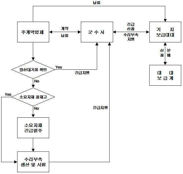 | 긴급소요 품목 발생시 지원 | - 소요군의 긴급소요(재고고갈/NORS) 발생시 지원방안과 업무절차 수립 | |