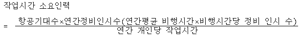 (2) 정비업무 소요인시의 판단은 연간업무빈도와 정비업무별 소요시간의 곱으로 얻어질 수 있다. 업무 빈도는 주로 장비의 작동시간과 고장율에 근거하며 업무별 연간 인시수를 계산하는 공식은 다음과 같다.