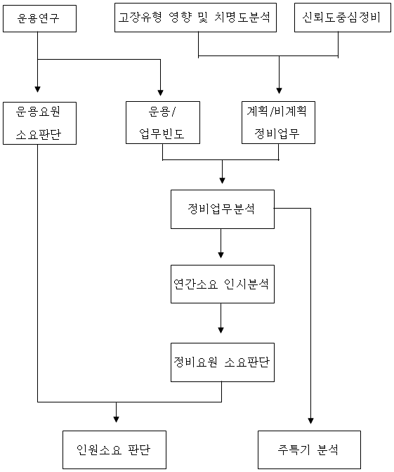 (3) 정비업무 소요는 FMECA, RCM, 정비업무분석 등에 의해 정비계단별, 계획/비계획 정비업무별로 산출한다.